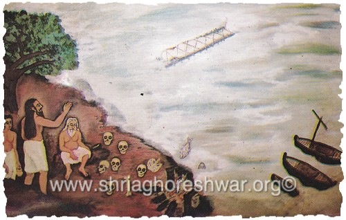 The two sadhus kept going through Kutch marshes (present-day Pakistan) and reached Hinglaj Devi’s shaktipeeth, where they stopped. Baba Kina Ramji started his penance in honour of the Goddess and soon a woman started to bring very good food to Him. Baba Kina Ramji asked the woman to introduce herself. Seeing her hesitating, he added that he would take no more food without knowing who she was. The woman manifested herself in her real form of Hinglaji Ma and invited the saint to go to Krim Kund in Kashi (Varanasi) in the future. Later on they retired on Himalaya for other practices. Then, accepting the invitation of Hinglaji Devi, they went to Kashi. When they arrived at the crematory ground of Harischandra Ghat, Kina Ramji saw an Aghor, Baba Kalu Ramji, in the midst of some skulls. Baba Kina Ramji recognized in that body the spiritual entity who had initiated him on the Girnar with Shri Dattatreya. Kalu Ramji said that he was hungry and Kina Ramji prayed to the Ganges. Immediately, some fishes jumped out of the river and ended straight up to roast on a near by funeral pyre. The Ganges was in flood and Kalu Ramji pointed to a floating body saying that it was a dead man. Kina Ramji replied that the body was not dead at all and called him on the river bank. Unrolling the body from the shrouds, a living being came out and became a disciple of Baba Kina Ramji. He was given the name of Ram Jivan Ram. Together, they set off for Krin Kund, where Kalu Ramji was living. Baba Kalu Ramji and Baba Kina Ramji established the eternal Dhuni (fire), kept continuously burning till today.